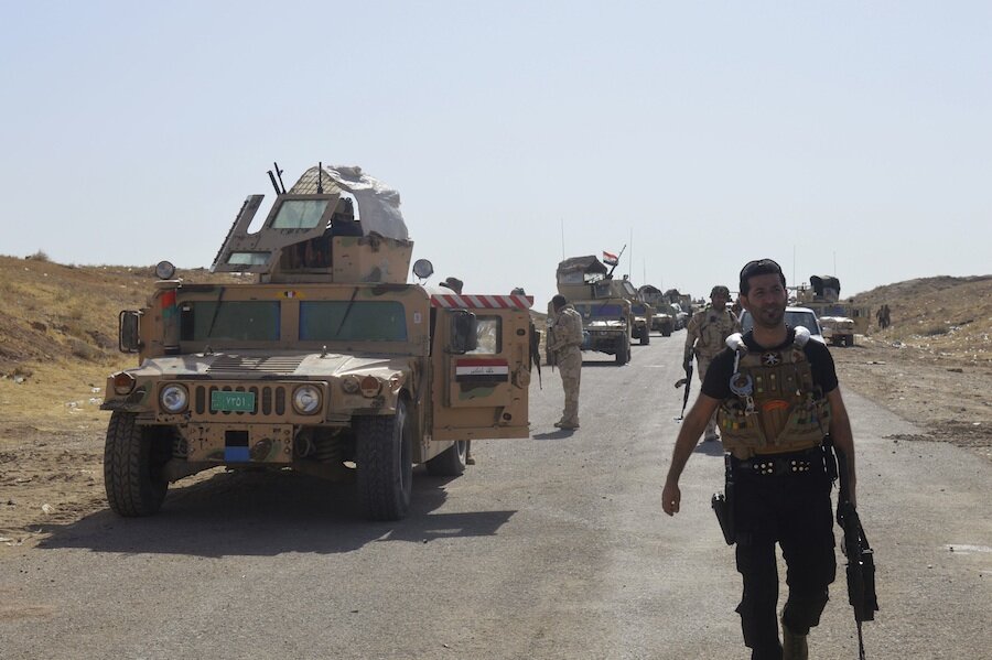 Military vehicles of Iraqi security forces are seen on a road during clashes with Islamic State militants in the Hamrin mountains in Diyala province in September 2014.